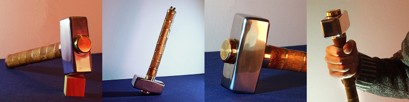 Habe vor ner Weile einen Eimer voller rostiger Werkzeuge bekommen. Darin war auch ein großer Hammerkopf ohne Stiel der schon etwas mitgenommen aussah. Den habe ich mal wieder schön gemacht, also so richtig schön dass man sich darin spiegeln kann und natürlich einen neuen Griff. Wobei der nicht einfach nur ein Holzstiel ist, sondern zusammen mit viel Messing eine Reinterpretation von Thor's Hammer Mjölnir bildet, wenn man den mit realen Materialien und unter praktischen Gesichtspunkten machen würde.. |